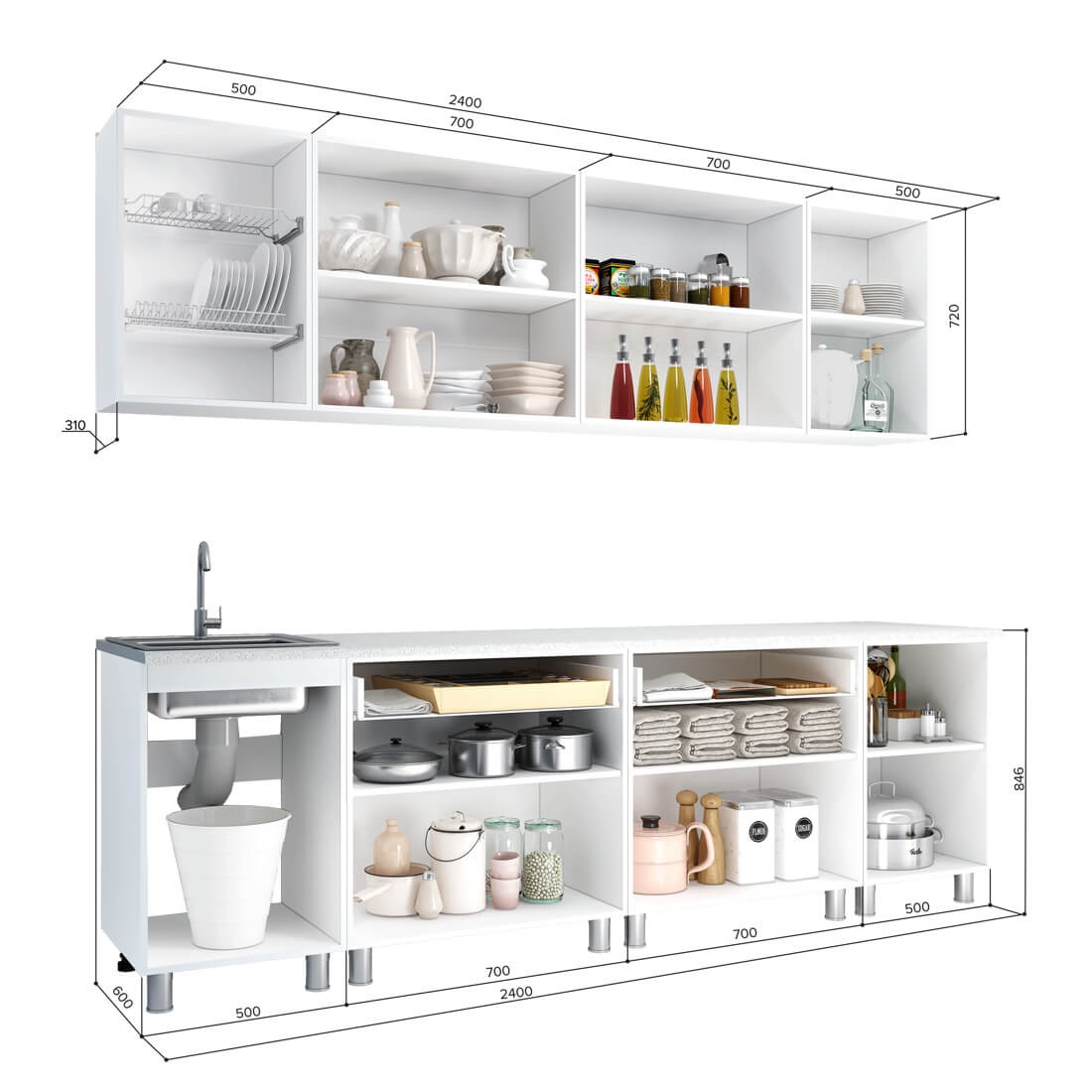 Габаритные размеры композиции нижних модулей с учётом столешницы: Ширина: 2400 мм. Высота: 846 мм. Глубина: 595 мм.