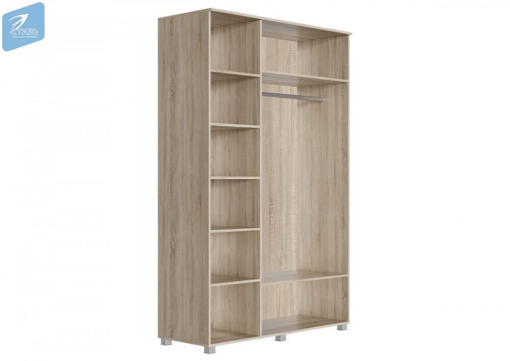 Шкаф трёхстворчатый состоит из секции с полками (шириной 1/3шкафа) и секцией со штангой и 2мя полками (шириной 2/3 шкафа).