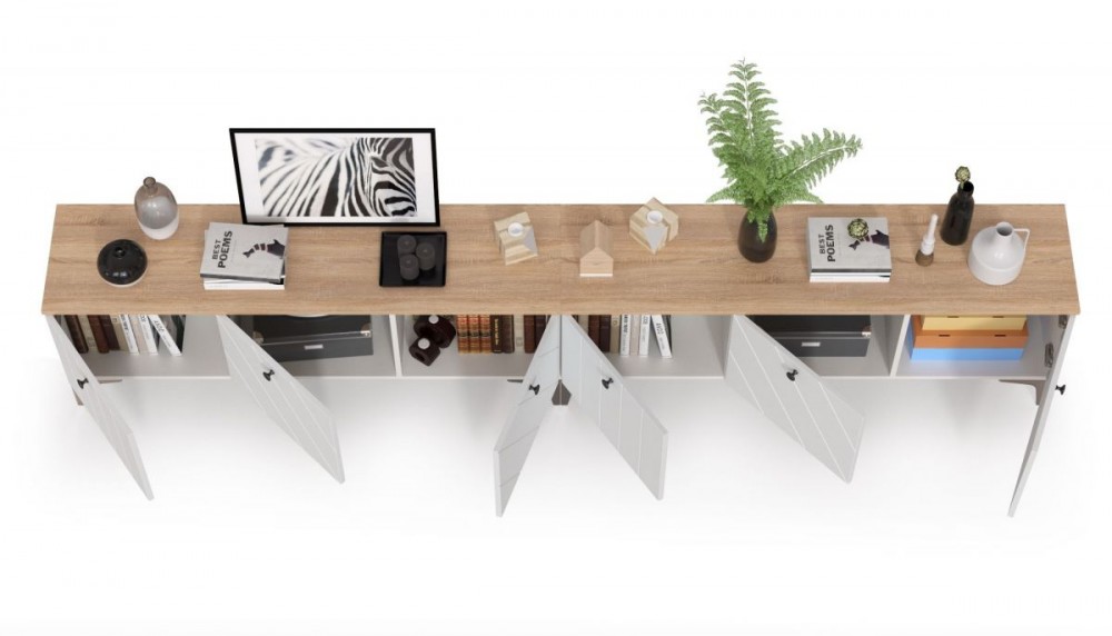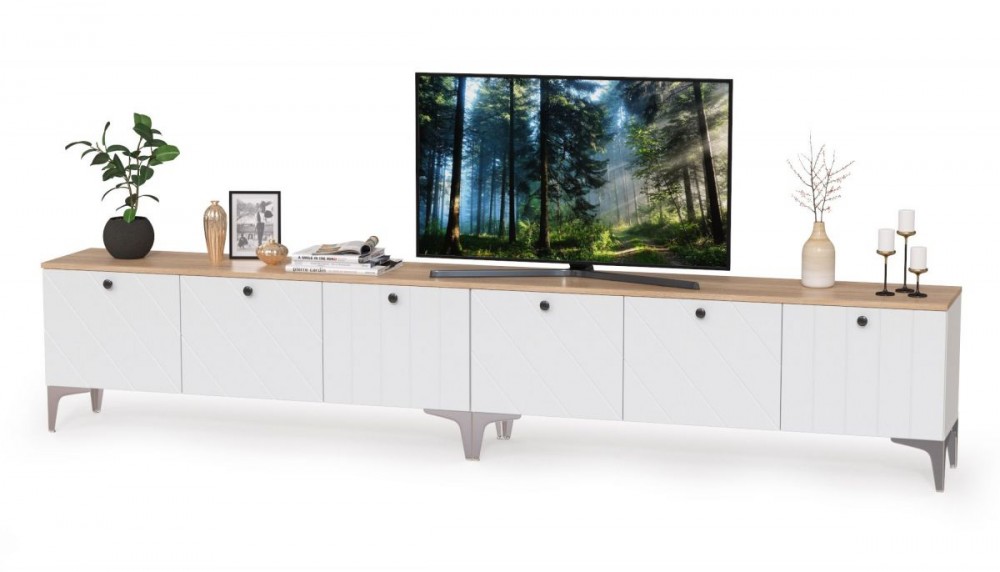 Тумба под ТВ 13.267.03 + 13.267.03, цвет белый шагрень/альберо/фасады МДФ милк софт, ШхГхВ 276,8х34,9х53,6 см., универс. сб., фасады перенавешиваются